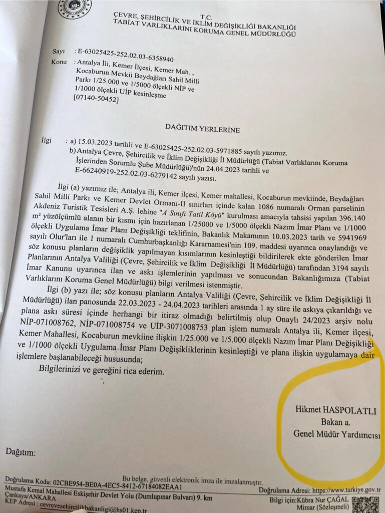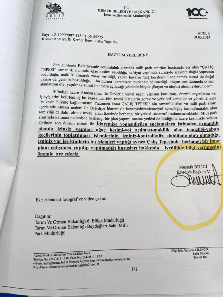 Devamında ”bakın arkadaşlar milli parkların kuralları çok serttir çocuk oyuncağı değildir, burada onca kepçe ve iş makinası çalışırken haberdar olunmaması mümkün değildir. Bu milleti kandırmayınız elinizde resmi bir belge varsa birazdan sizlere de dağıtacağım gibi önümüze koyarsınız. Clup Med 1969 yılında Kemer’de turizme tahsis edilip ön onayı verilen ilk yerdir. 1971 yılında ise ön onay resmi onaya çevrilmiştir fakat bu zamana kadar orman olan bu yer 1972 de milli park olarak ayırılmıştır. Clup Med denilen Fransız şirket burayı 49 yıl çalıştırmış ancak tahsis alanı kesinlikle değiştirilmemiştir. 2023 yılında ise Özak isimli bir şirkete devredilmiştir, fakat bu devir esnasında Orman Genel Müdürlüğü Milli parka buradaki çalı çırpının temizlenmesi gerektiğini bildirmiştir hatta geçen yaz kurumuş ağaç ve odunlar yangına sebebiyet vermiştir ondan dolayıdır ki bir temizlik elzem olmuştur. Bu temizlik yapılırken hükümet muhalifi bir kişide bu temizlik esnasında burada bulundurulmuştur tüm bu olaylar esnasında 100 siter odun elde edilerek milli parklar şefliği kontrolünde Kuzdere’deki orman deposuna teslim edilmiştir. Bunun dışında herhangi hukuka kanuna aykırı bir durum söz konusu değildir” dedi.