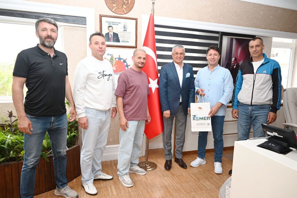 Kemer Ayyıldız Masterler Futbol Takım Kaptanı Hacı Çelik ve oyuncular, Kemer Belediye Başkanı Necati Topaloğlu’na makamında nezaket ziyaretinde bulundu.