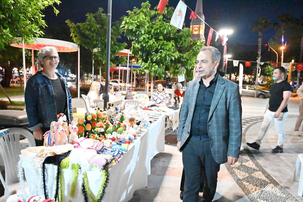 Kermeste tezgâh açan ev hanımlarını ziyaret eden Kemer Belediye Başkan Yardımcısı Mehmet Derya Baytekin, ev hanımlarının ürünlerini inceleyerek hayırlı işler dileklerinde bulundu.