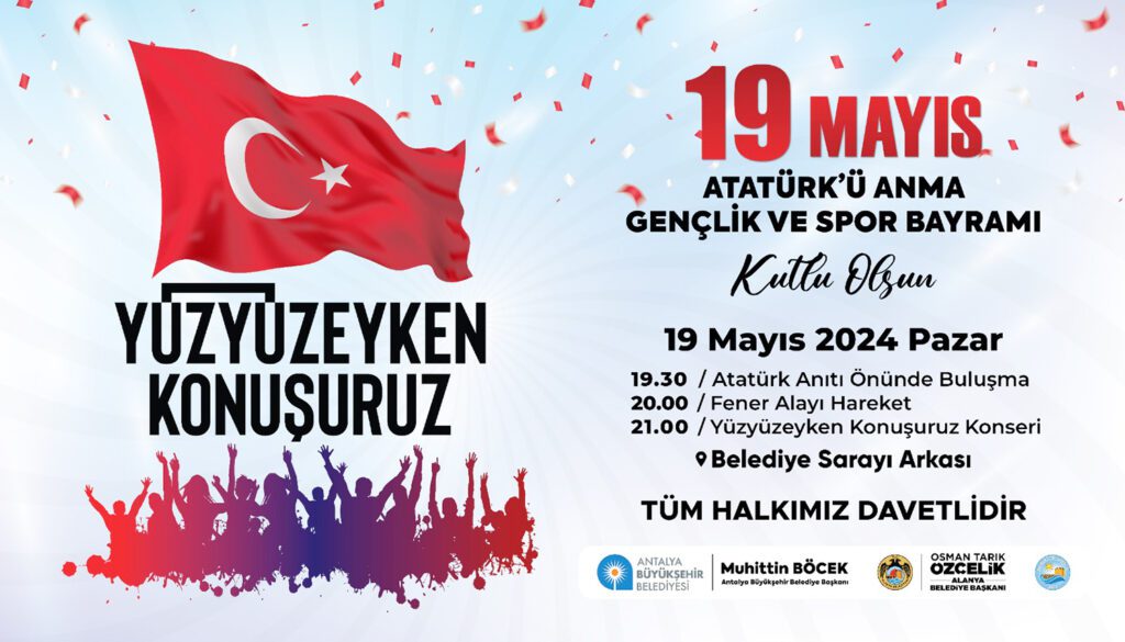 19 Mayıs coşkusu Alanya’da da yaşanacak. Antalya Büyükşehir Belediyesi ve Alanya Belediyesi işbirliğiyle düzenlenecek etkinlikte 19 Mayıs Pazar günü saat 19.30’da Atatürk Anıtı önünde buluşularak Fener Alayı düzenlenecek. Alanya’daki kutlamalar saat 21.00’de Belediye Sarayı arkasında düzenlenecek Yüzyüzeyken Konuşuruz grubunun konseri ile devam edecek.