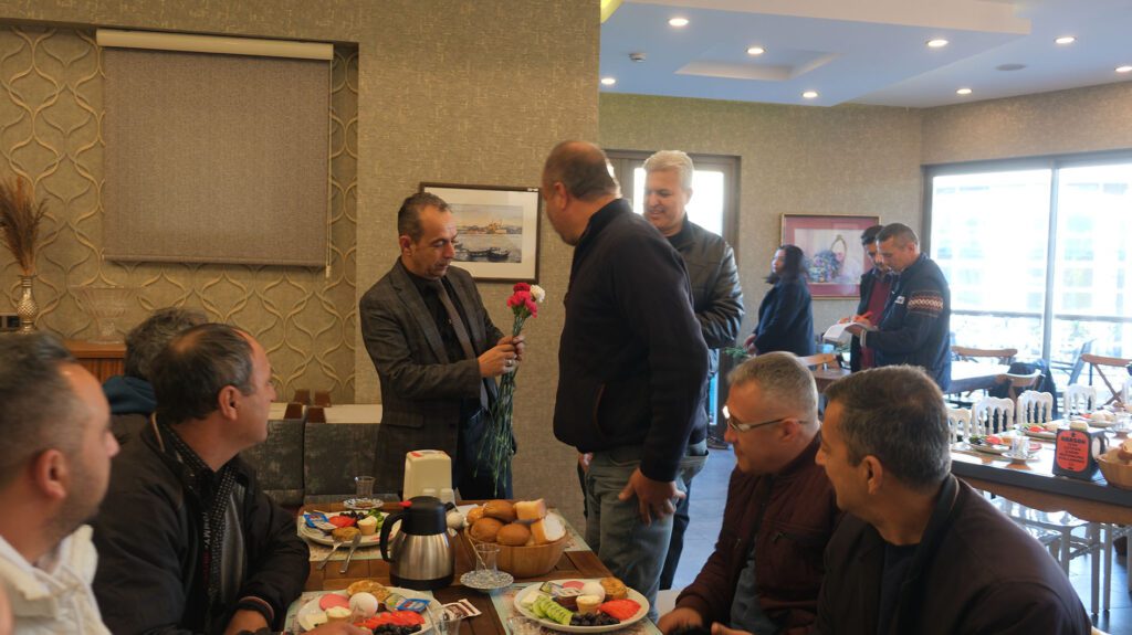 Başkan Yardımcısı Baytekin, kahvaltı sonrası Kemer VİP Tur Başkanı Oktay Çelik ile birlikte şoförlere karanfil dağıttı.