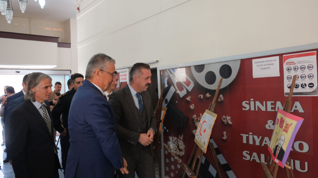 Kaymakam Solmaz ve Başkan Topaloğlu, program öncesinde öğrencilerin yaptığı İstiklal Marşı konulu resim sergisini gezdi.