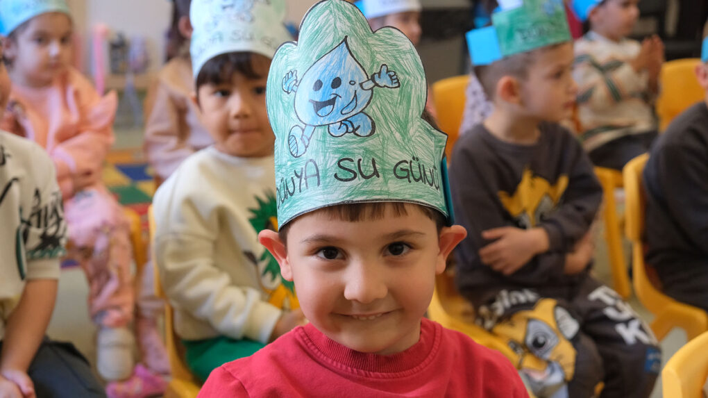 Ayrıca öğrencilerin öğretmenleri eşliğinde hazırladığı Dünya Su Günü yazılı şapkaları takması renkli görüntüler oluşturdu.