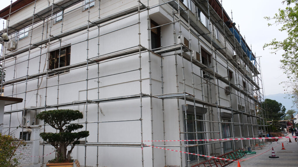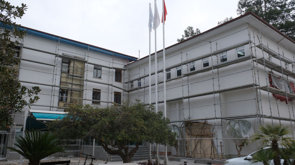 Kemer Belediye binasının iç ve dış cephesinde tadilat çalışmaları son hızla devam ediyor.