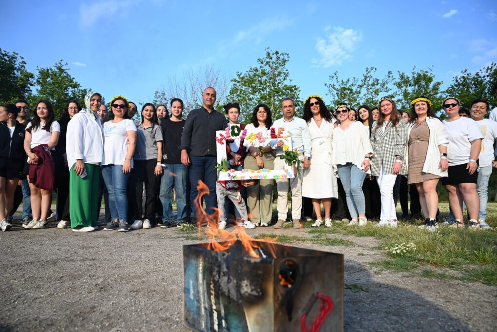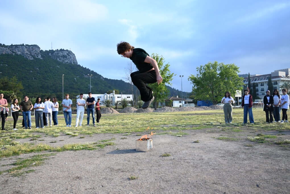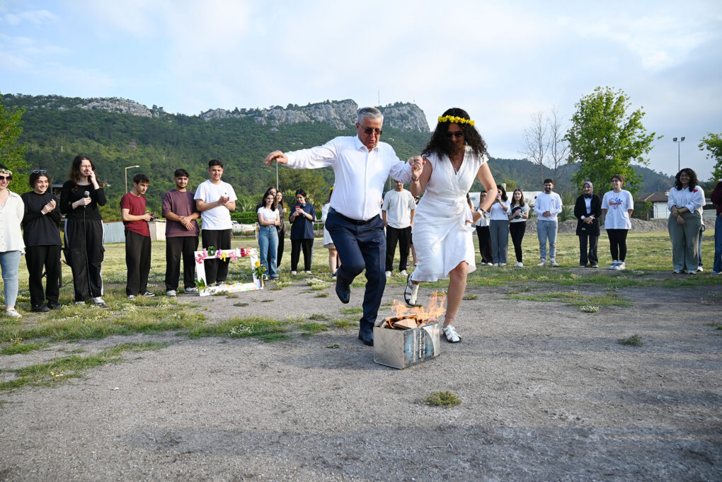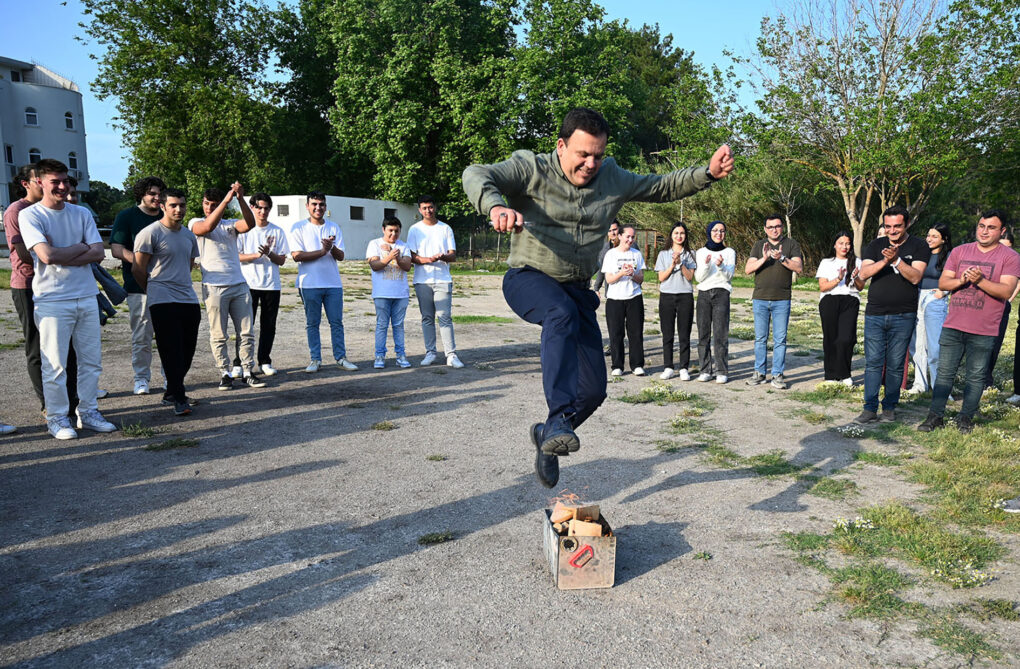 Öğrencilerle tek tek selamlaşarak sohbet eden Başkan Topaloğlu, Başkan Yardımcıları Semih Top ve Mehmet Derya Baytekin, edilen duaların ardından öğrencilerle ve öğretmenlerle ateşin üstünden atladı.