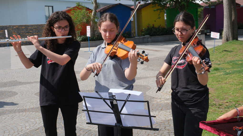Kemer Anadolu Lisesi öğrencileri sergi sırasında keman ve yan flütle mini bir konser vermesi renkli görüntülere sahne oldu.
