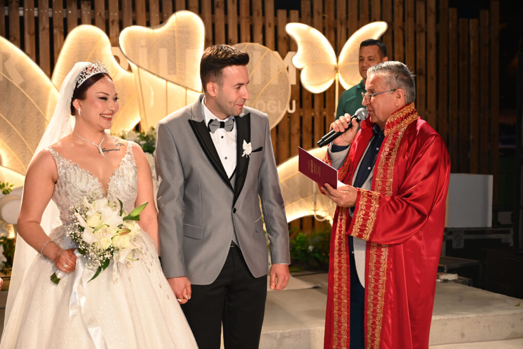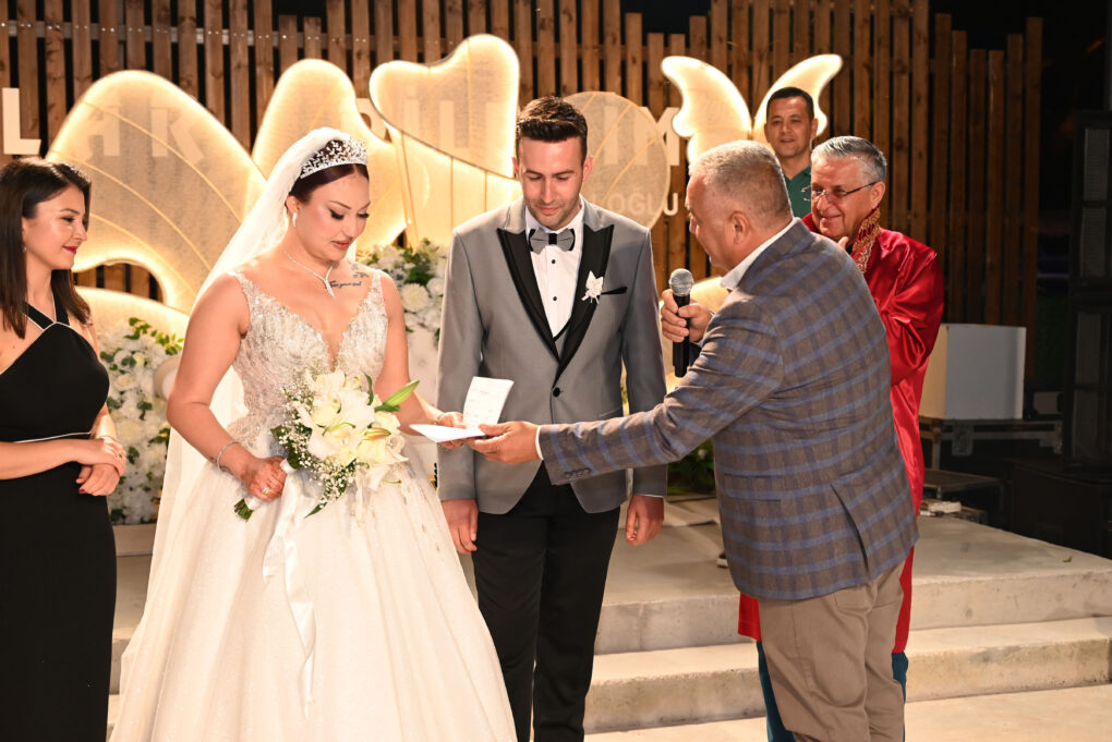 Şahitler ve davetlilerin huzurunda atılan imzalar sonrasında Başkan Topaloğlu, aile cüzdanını vermesi için meclis üyesi Mehmet Akın’ı sahneye davet etti. Meclis Üyesi Akın ise aile cüzdanını geline vererek tebrik etti.