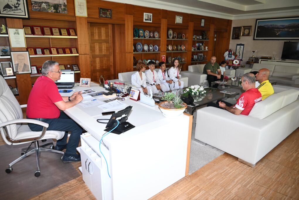 Kemer Belediyesi Karate Antrenörü Emin Akar ve sporcular, Başkan Topaloğlu’nu ziyaret ederek, karate antrenmanları ve katılacakları organizasyonlar hakkında bilgi verdi.