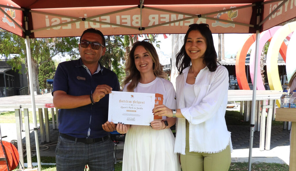 Başkan Topaloğlu ve beraberindekiler, etkinliğe destek veren turistik otellerin temsilcilerine katılım sertifikası vererek hatıra fotoğrafı çektirdi.
