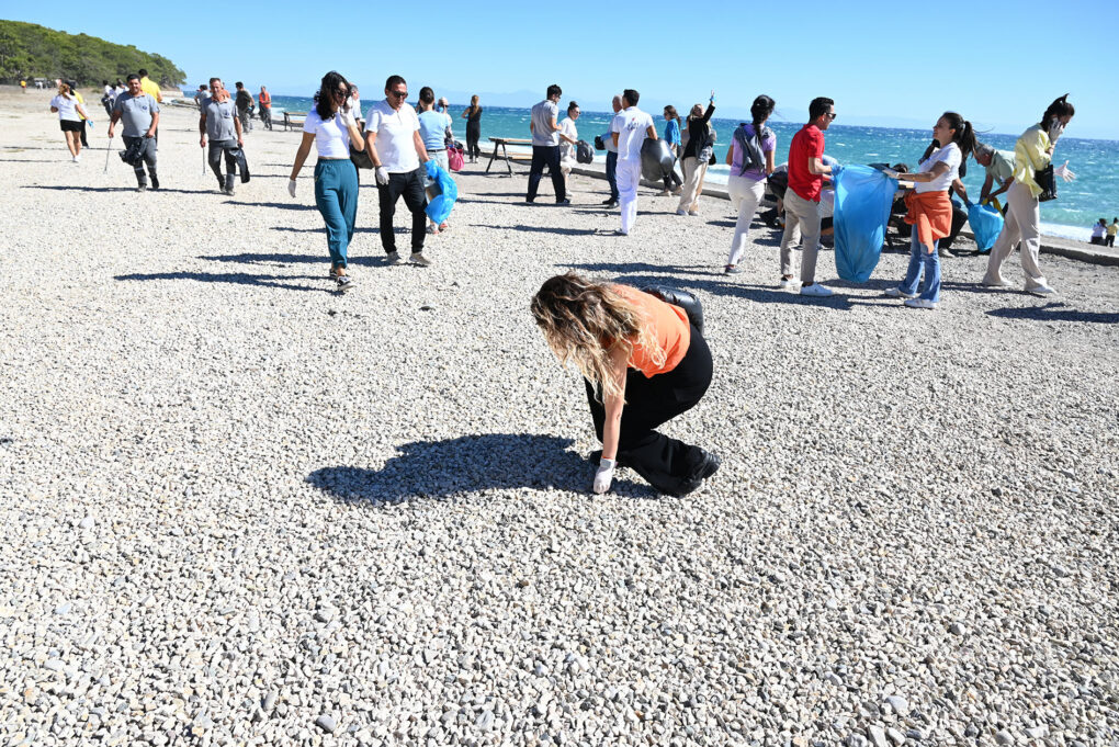Etkinliğe katılanlar, Kemer Belediyesi Temizlik İşleri Müdürlüğü ile İklim Değişikliği ve Sıfır Atık Müdürlüğü ekipleri tarafından dağıtılan eldiven ve çöp poşetlerini alarak sahildeki atık ve çöpleri temizledi.