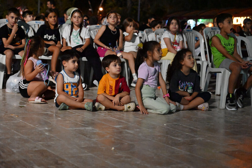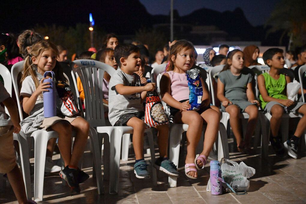 Açık havada sinema keyfi yaşayan çocuklar, eğlenceli anlar yaşayarak güzel bir akşam geçirdi.