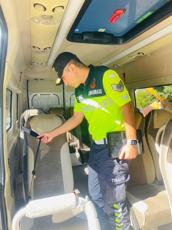 Okul servis araçları ve şoförlerinin denetim ve sorgularını yapan timler; Araçların servis yönetmeliğine uygunluğu, öğrencilerin emniyet kemeri takıp takmadıkları ve trafikte dikkat edecekleri hususlar denetlenerek, sürücü ve öğrencilere dikkat edilecek konular anlatılmıştır.