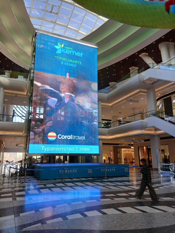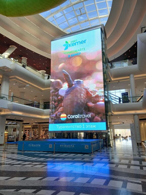 Geçtiğimiz yıl Moskova’da dev ekranlarda yayınlanan Kemer reklamları bu yıla da damgasını vurdu. Moskova’nın işlek caddeleri ve büyük alışveriş merkezlerinde yer alan dev ekranlarda Kemer’in tanıtım videoları yayınlanıyor.