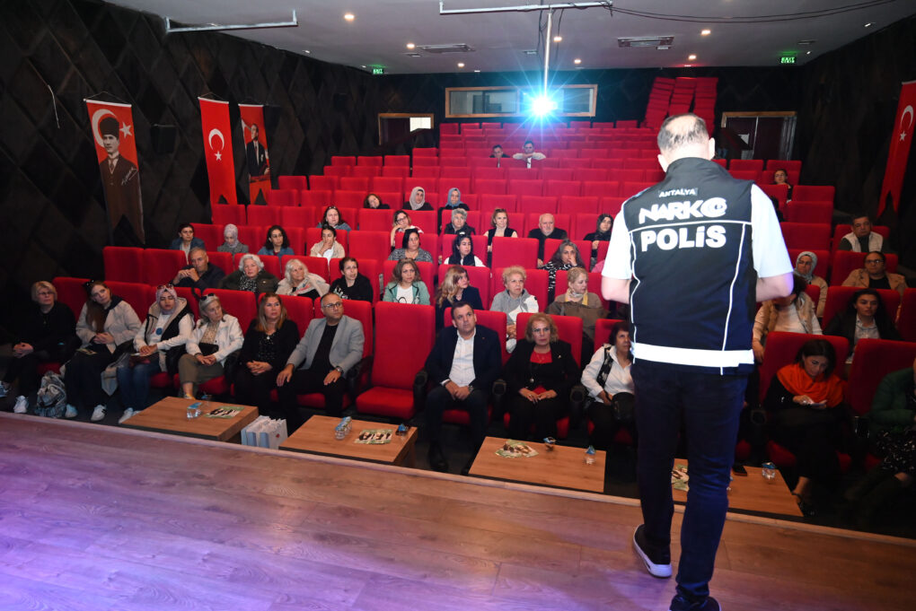 Antalya Narkotik Suçlarla Mücadele Şube Müdürlüğü’nden Narko Rehber Polis Memurları Arif Erdem ve Ayşe Kalpakçı tarafından verilen seminerde, uyuşturucu maddenin tanımı, uyuşturucuya başlama nedenleri, çocukların uyuşturucudan korunması, madde bağımlılığında ailenin görevleri ve yapması gerekenler, bağımlılık döngüsü, tedavi yöntemleri, uyuşturucu ile mücadele yönetmeleri gibi konularda katılımcılara bilgi verildi.