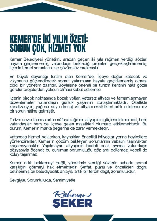 Şeker, Kemer’de son iki yıllık belediye yönetimini eleştirerek, verilen sözlerin hayata geçirilmediğini ve ilçede beklenen projelerin tamamlanamadığını ifade etti. Paylaşımında, özellikle altyapı eksiklikleri, bozuk yollar ve tamamlanmayan düzenlemelerin vatandaşın günlük yaşamını olumsuz etkilediğini vurguladı.
