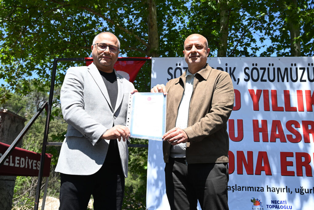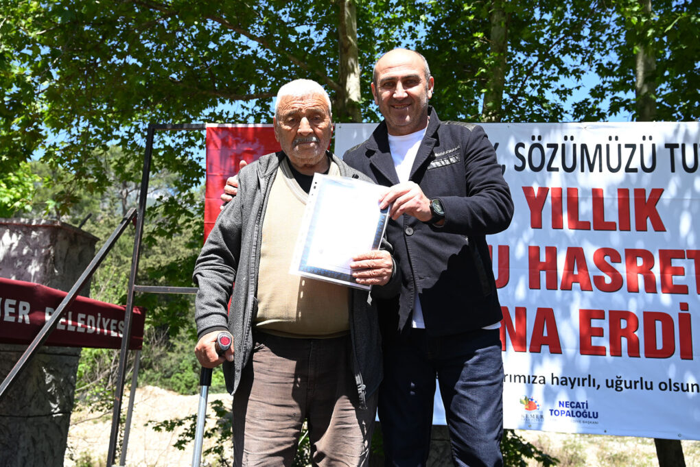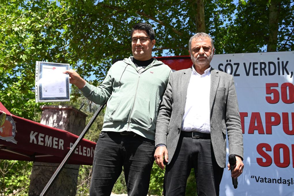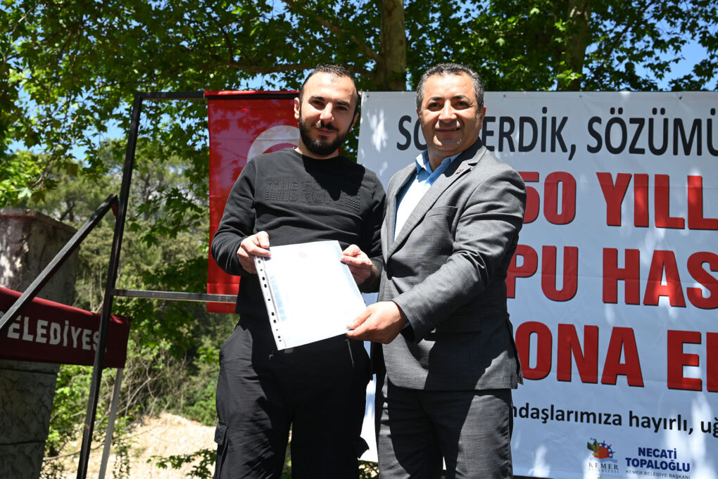Kemer’in Beldibi Mahallesi’nde yaşayan vatandaşların 50 yıllık tapu hasreti sona erdi. Kemer Belediye Başkanı Necati Topaloğlu, 50 yıl sonra 800 dönümlük alandaki hak sahiplerine düzenlenen törenle tapularını dağıttı.