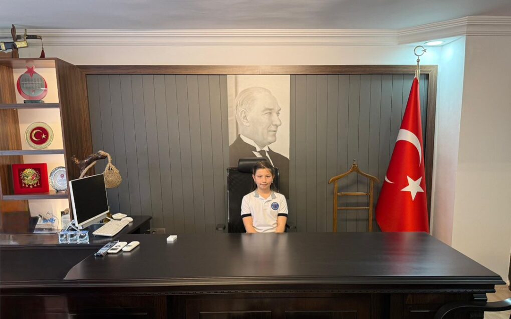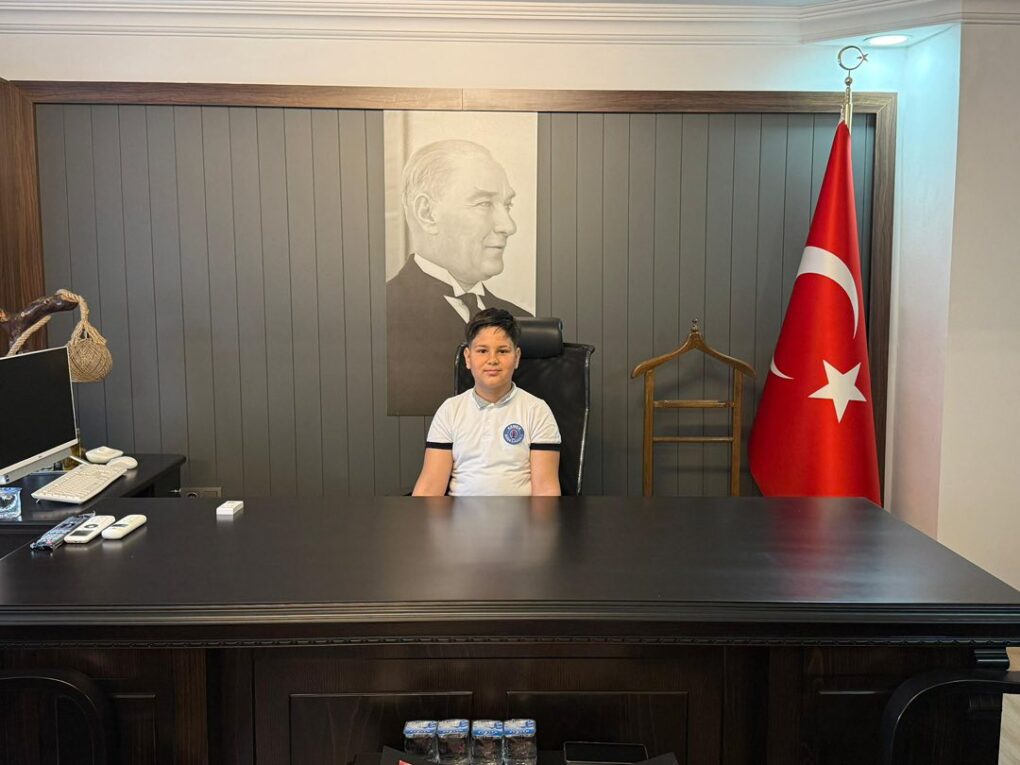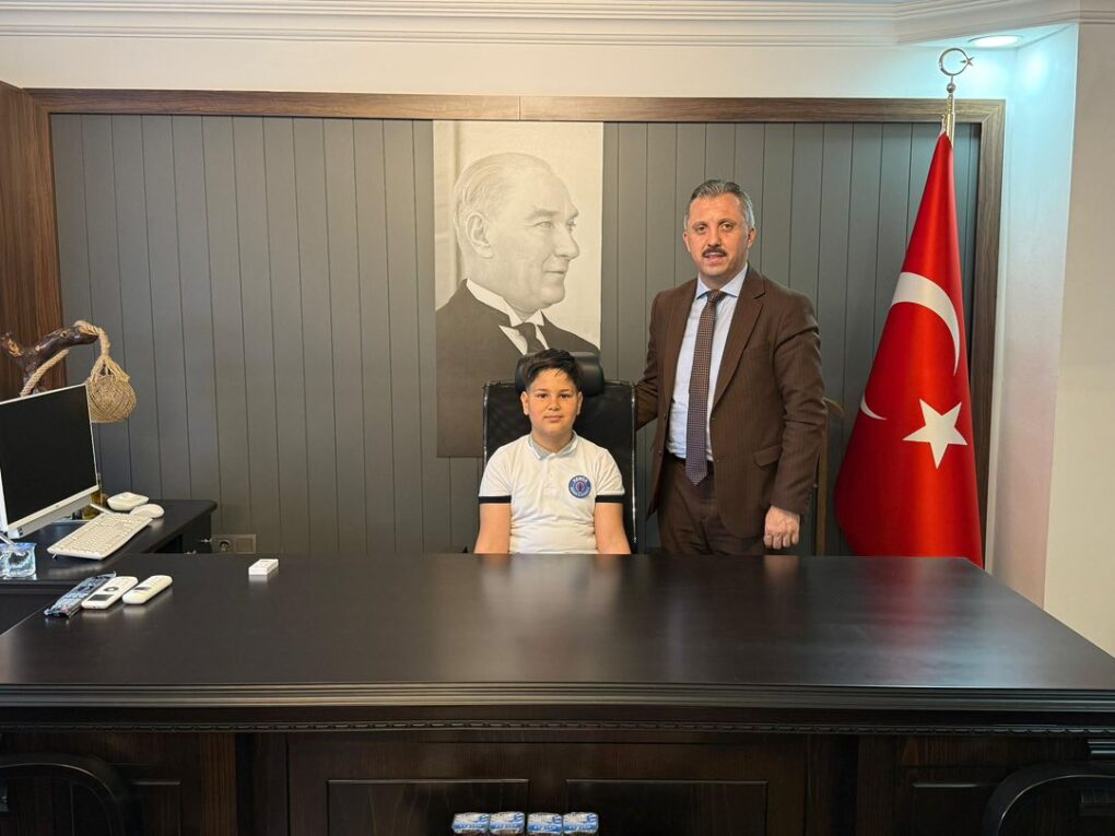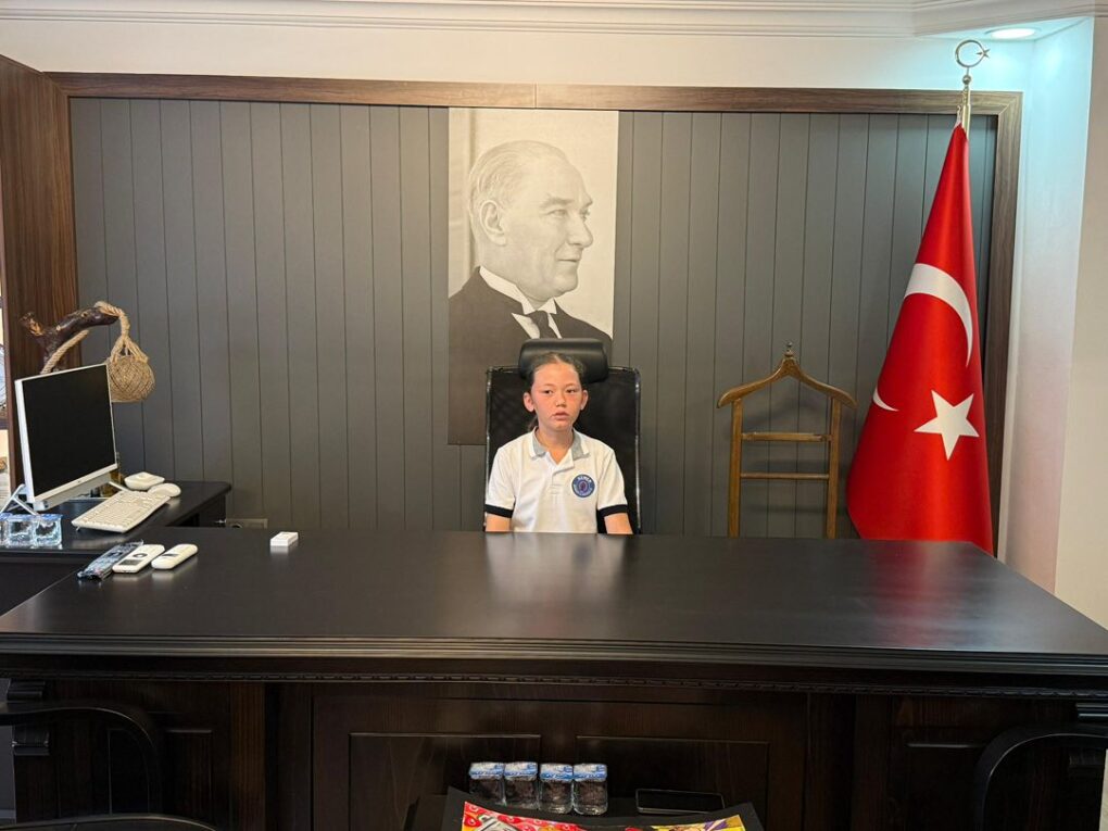 Kemer Kaymakamı Ahmet Solmaz’ı makamında ziyaret eden minik öğrenciler, bayramın anlam ve önemine yakışır şekilde temsili olarak makam koltuğuna oturarak duygu ve düşüncelerini ifade etti.